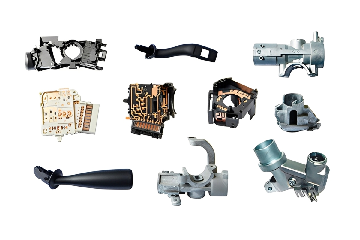 Circuit boards, connectors, devices; stamping applications include metal brackets, enclosures, contacts, terminals, mounting plates.