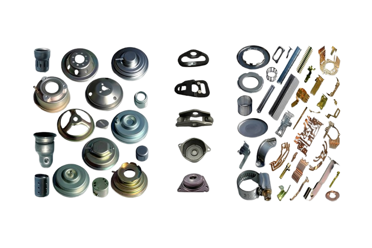 Brackets, fittings, machinery parts; stamping applications include angle brackets, hinges, fasteners, mounting plates, support brackets.